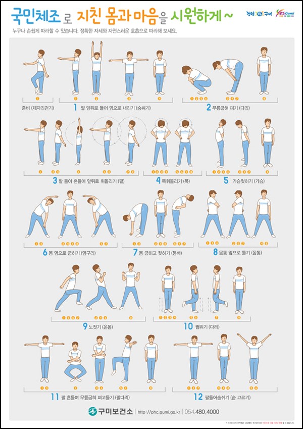국민체조는 1977년 3월부터 대한민국 정부에서 보급한 체조로 음악과 구령에 맞추어 12개 동작으로 이루어져 있습니다. 학교를 다닌 분들이면 모두 국민체조를 따라하셨을텐데요. 오늘은 국민체조 동영상 바로보기와 국민체조 효과에 대해 알려드리겠습니다.