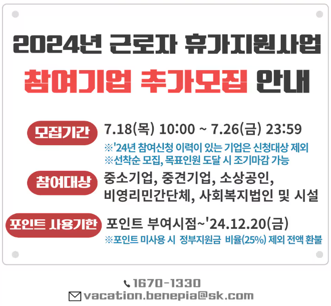 2024년 7월 18일부터 26일까지 근로자 휴가지원사업 참여기업을 추가로 모집합니다. 오늘은 정부와 기업이 함께 소상공인 및 중소기업에 근무하는 근로자에게 휴가를 즐길 수 있도록 지원하는 제도인 근로자 휴가 지원 사업에 대해 알아보겠습니다.