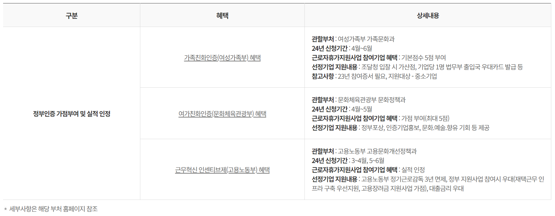 2. 정부인증 가점 부여 및 실적 인정 : 가족친화인증, 여가친화인증, 근무혁신 인센티브제 등의 정부인증 제도, 신청시에 가점 및 실적 인정이 됩니다.