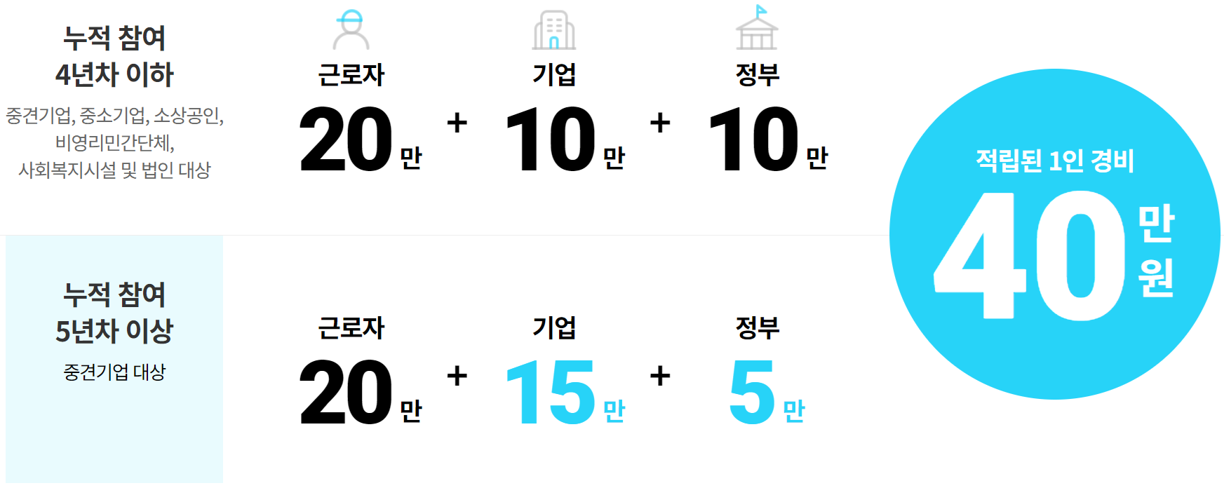 근로자가 20만원을 부담하면 기업과 정부가 각각 10만원으로 매칭하여 총 40만원의 휴가비를 적립해줍니다. 누적 참여 5년차 이상인 중견기업은 근로자 20만원 부담하면 기업 15만원, 정부 5만원을 지원해줍니다.