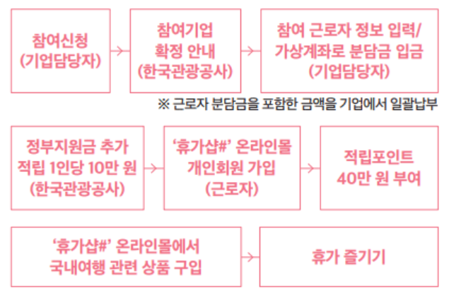 먼저 기업 담당자가 참여신청을 해야 합니다. 한국관광공사에서 확정 안내를 받으면 참여하는 근로자의 정보를 입력하고 가상계좌로 분담금을 입금합니다. 이후에는 한국관광공사에서 정부지원 금으로 1인당 10만원 적립이 됩니다.