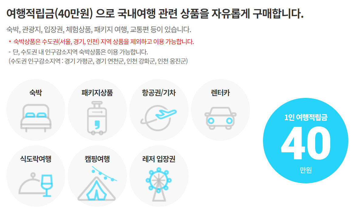 여행적립금이 조성되면, 참여근로자는 국내여행 휴가샵 온라인몰에서 40만원 적립 포인트를 자유롭게 사용할 수 있습니다.