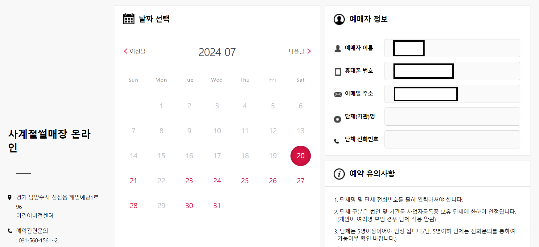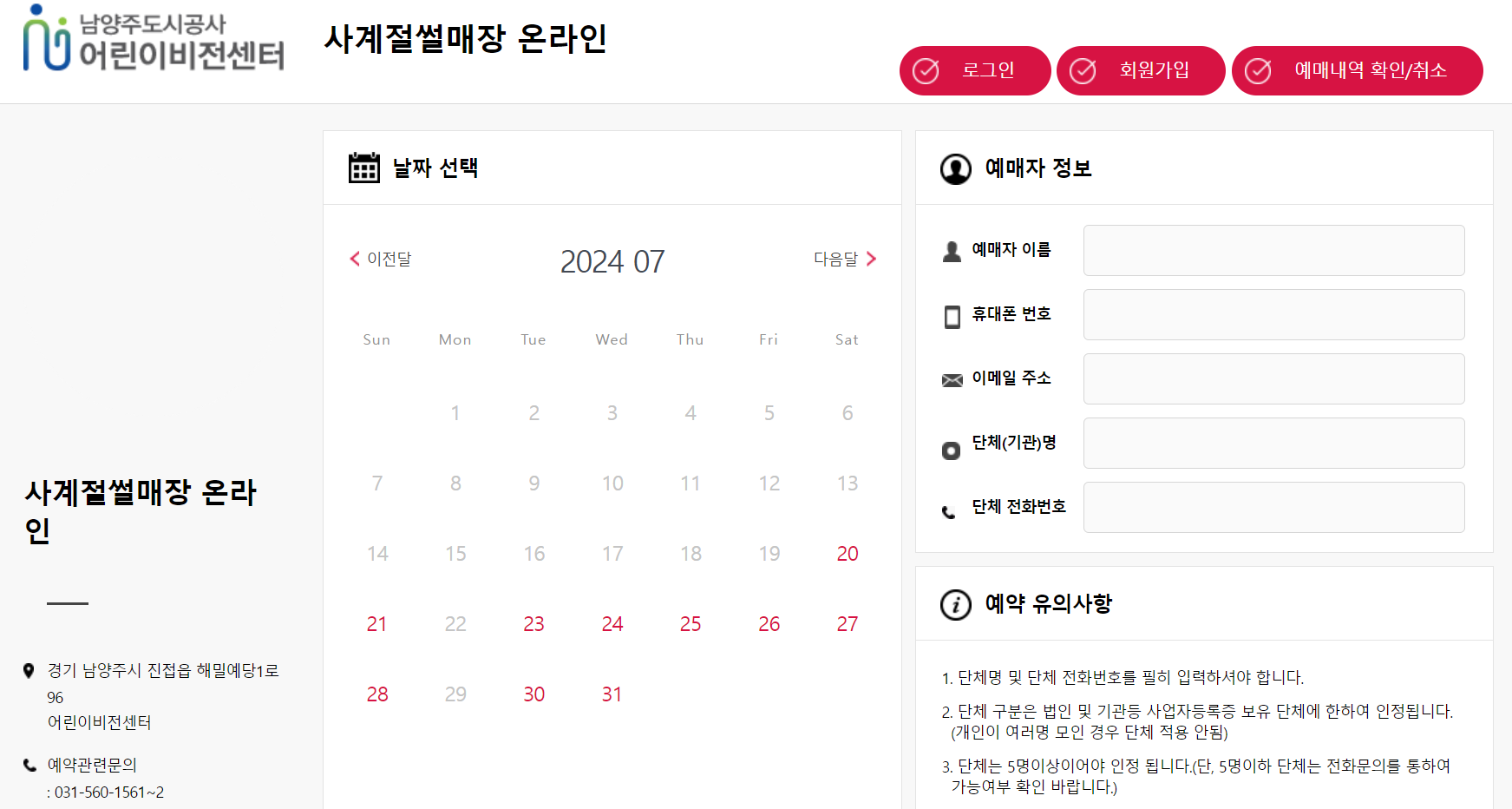 개인은 온라인 예약으로만 1인 5매 제한하여 받고 있습니다. 단체는 20명 이상 전화접수로 신청하시면 됩니다. 자세한 문의는 031-560-1561, 031-560-1562로 확인하시기 바랍니다.