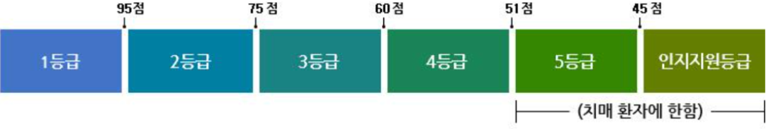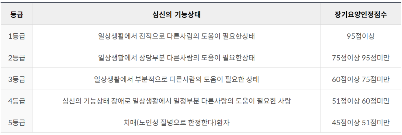 1등급은 95점 이상을 받아야 합니다. 일상생활에서 전적으로 다른사람의 도움이 필요한 상태를 의미합니다. 2등급은 75점이상 95점 미만, 3등급은 60점 이상 75점 미만, 4등급은 51점 이상 60점 미만, 5등급은 45점 이상 51점 미만입니다.