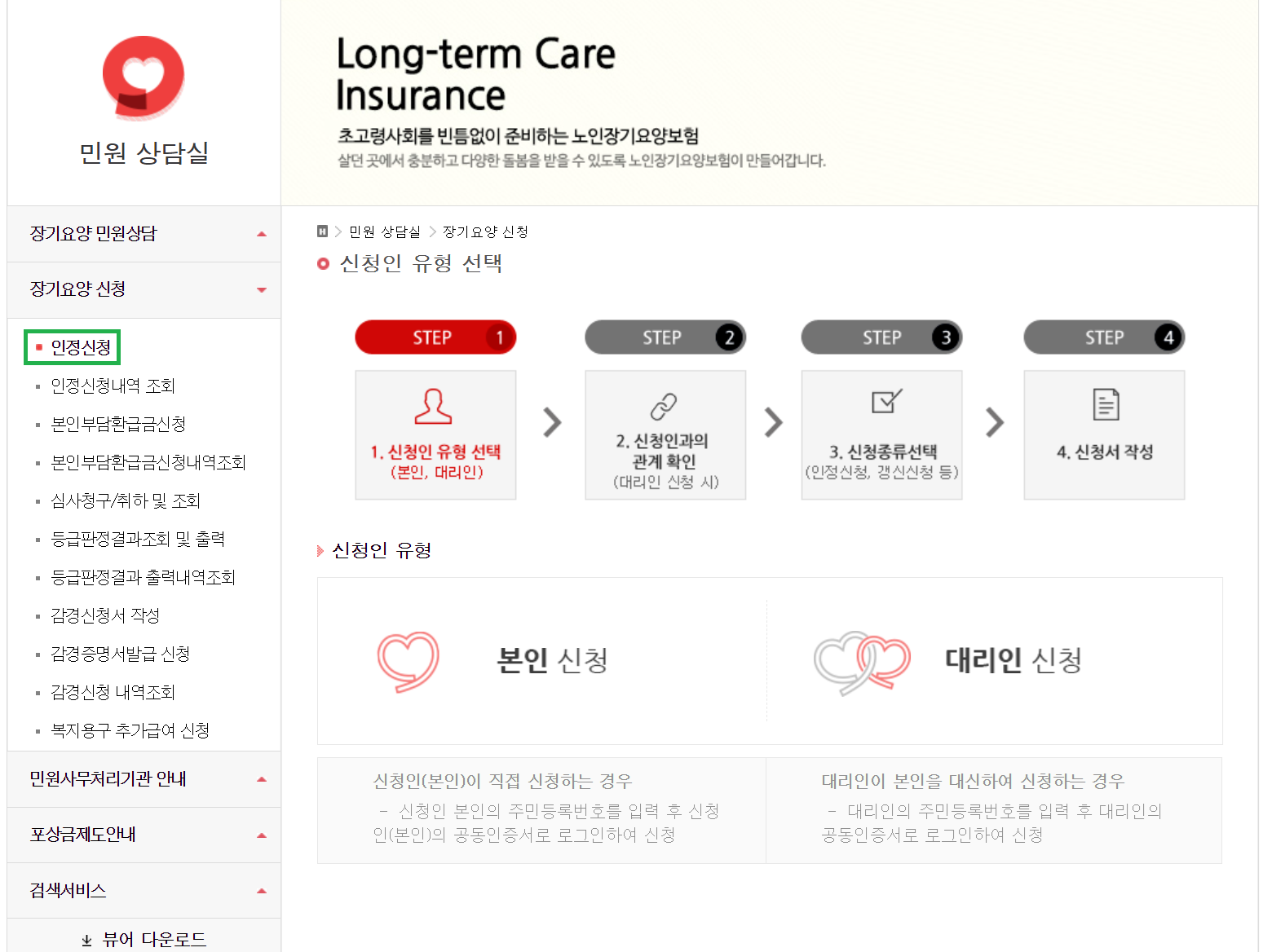 위의 버튼을 눌러서 국민건강 보 험 홈페이지 접속 > 민원 상담실 > 장기요양 신청 > 인정신청 클릭