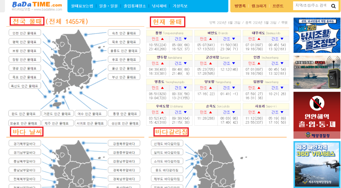 전국 물때표 그리고 현재물때, 바다날씨, 바다갈라짐, 수온, 낚시포인트까지 안내해 줍니다.