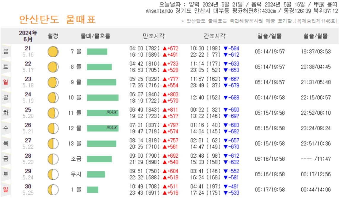 - 조석 : 바다의 물이 들어오고 나가는 시작점의 (만조, 간조) 일별 시간표시