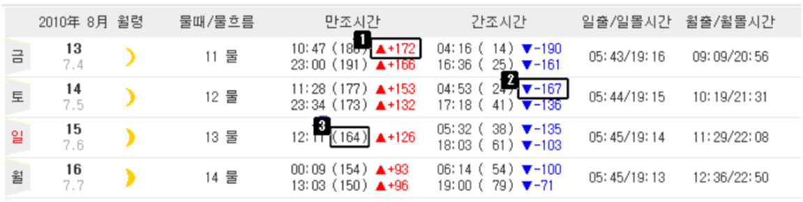 만조시간은 물이 가장 많이 차 올랐을 때이며, +숫자는 간조 이후 차오른 해수면 높이의 차이를 의미합니다. 간조시간은 물이 가장 많이 빠졌을 때이며, -숫자는 만조에서 빠진 해수면 높이의 차이를 의미합니다. 3번의 괄호() 안 숫자는 물의 높이를 cm(센티미터) 단가로 나타냅니다.
