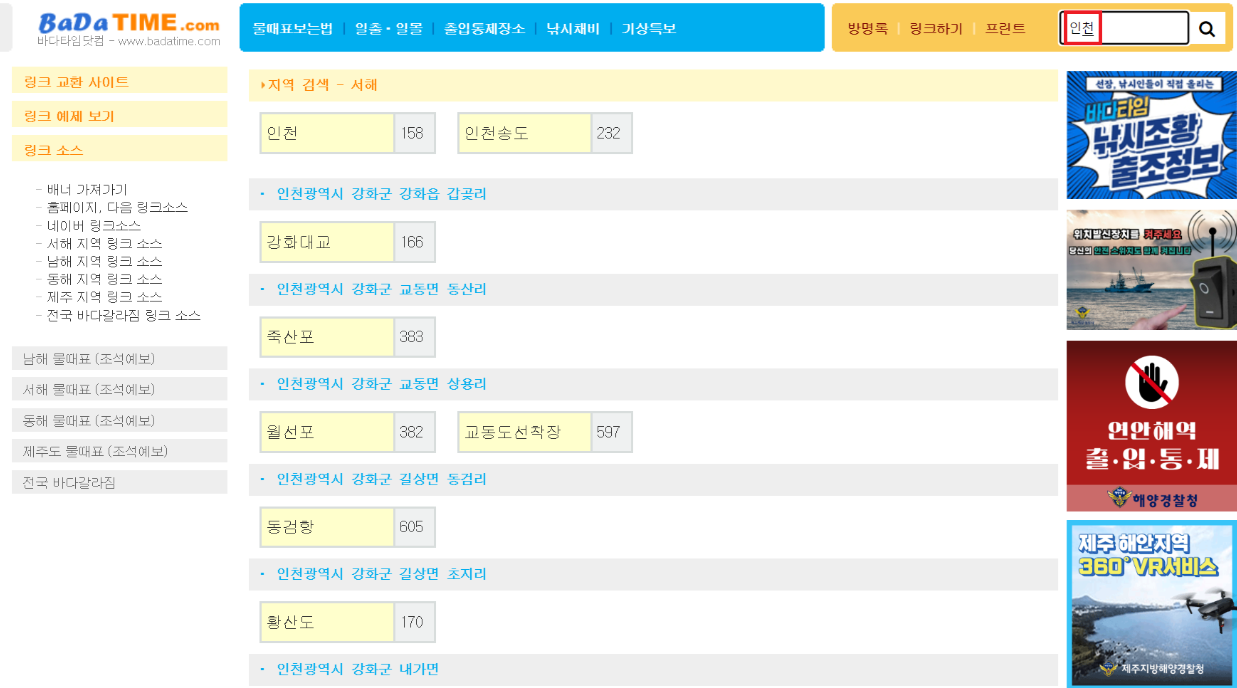 지역을 선택했다면 만조시간과 간조시간을 확인합니다. 해루질(조개잡기)을 하거나 바다 낚시할 시간을 경정하기 때문에 매우 중요합니다.
