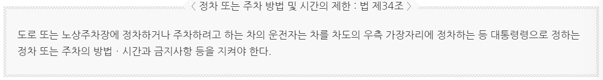 도로 또는 노상주차장에 정차하거나 주차하려고 하는 차의 운전자는 차를 차도의 우측 가장자리에 경차하는 등 대통령령으로 정하는 정차 또는 주차의 방법/시간과 금지사항 등을 지켜야 한다.