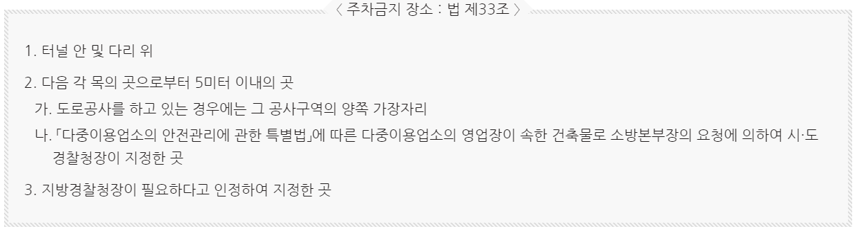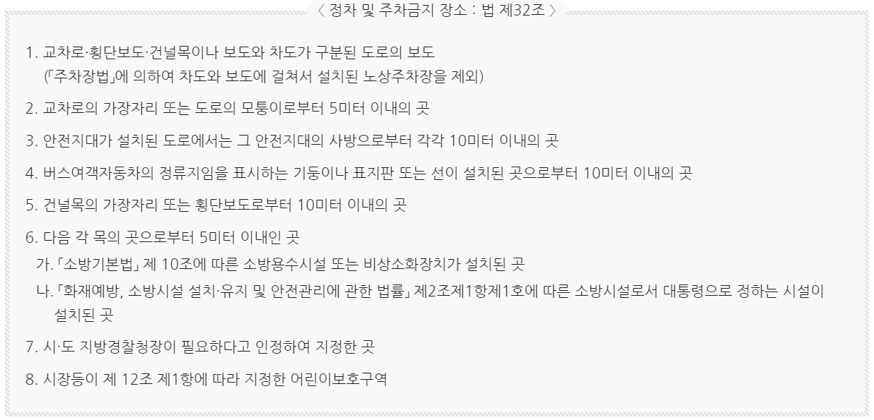 - 도로교통법 제32조(정차 및 주차의 금지), 제33조(주차금지의 장소), 제34조(정차 또는 주차의 방법 및 시간의 제한)를 위반한 차량