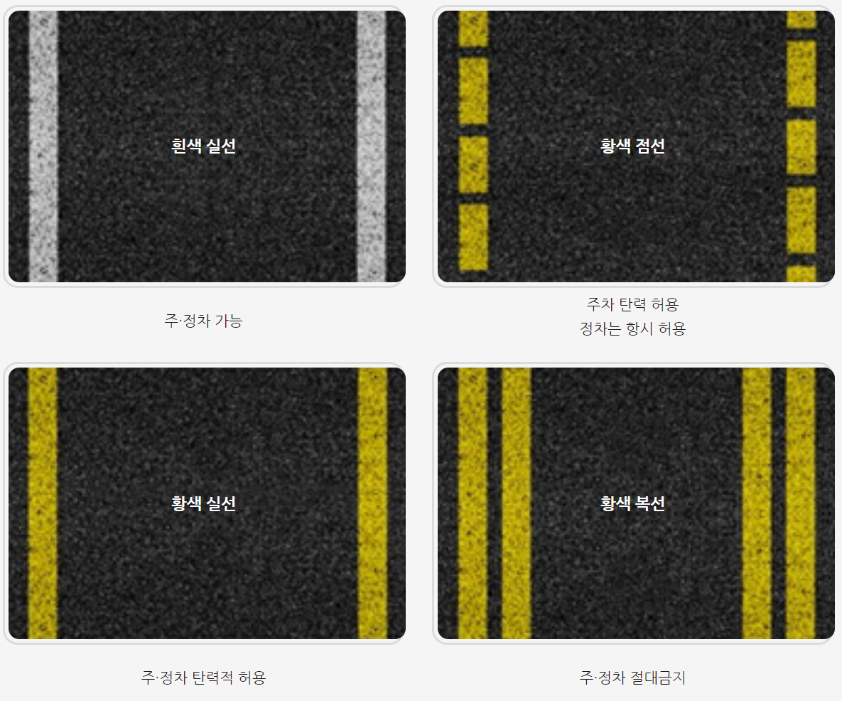 노면 표시에 흰색실선이라면 주차와 정차가 가능하지만 황색 복선이라면 주차와 정차는 절대 할 수 없습니다. 황색 점선은 주차를 탄력적으로 허용하고 정차는 항시 허용, 황색 실선의 경우는 주차와 정차를 탄력적으로 허용한다는 의미입니다.