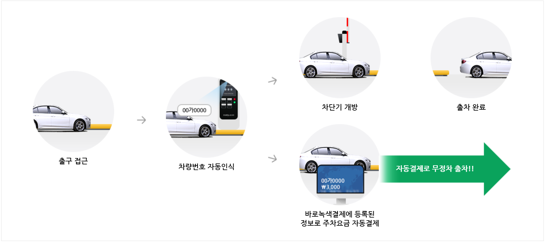 출구 접근 > 차량번호 자동인식 > 차단기 개방 > 출차 완료