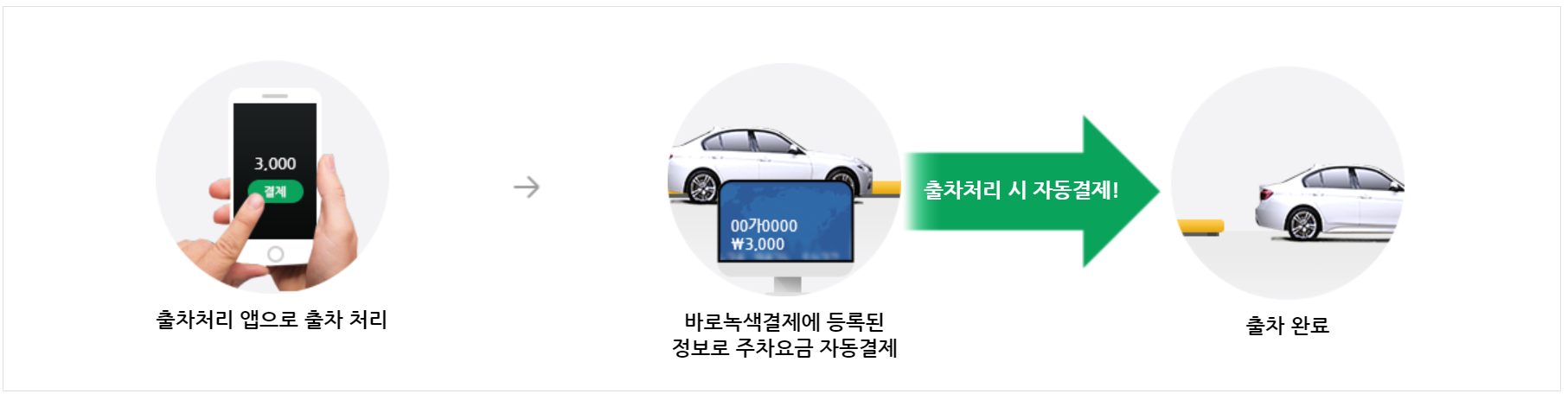 출구 접근 > 차량번호 자동인식 > 바로녹색결제에 등록된 정보로 주차요금 자동결제 (자동결제로 무정차 출차)