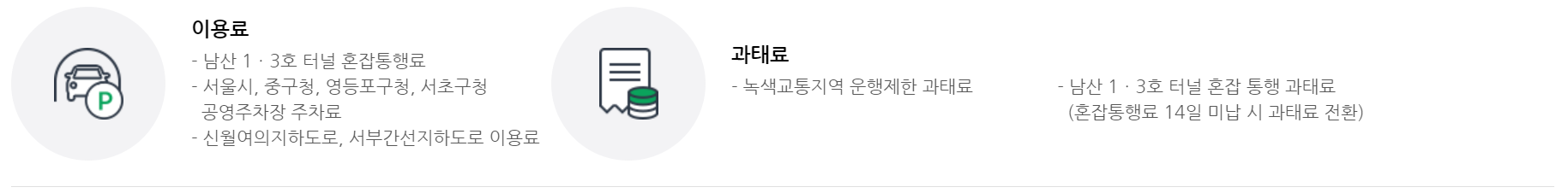 • 남산 1, 3호 터널 혼잡 통행 과태료 (혼잡통행료 14일 미납 시 과태료 전환)