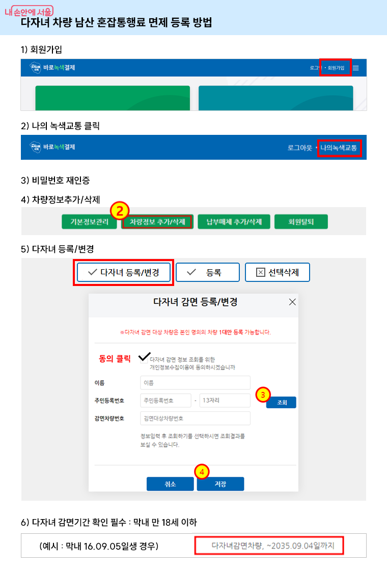 서울시 공영주차장 주차요금 및 남산 1, 3호 터널 혼잡통행료 다자녀 가족 자동감면을 위한 차량등록 방법을 안내드립니다. (시행일 : 2024년 8월 21일 수요일)