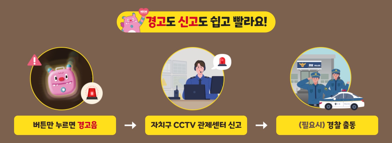 긴급상황이 발생했을 때 헬프미에 있는 긴급신고 버튼을 클릭하면 헬프미와 안심이 앱에서 경고음이 발생하며 5초 후에 바로 긴급신고가 자치구 CCTV 관제센터로 접수됩니다. 필요시에 경찰이 출동합니다.
