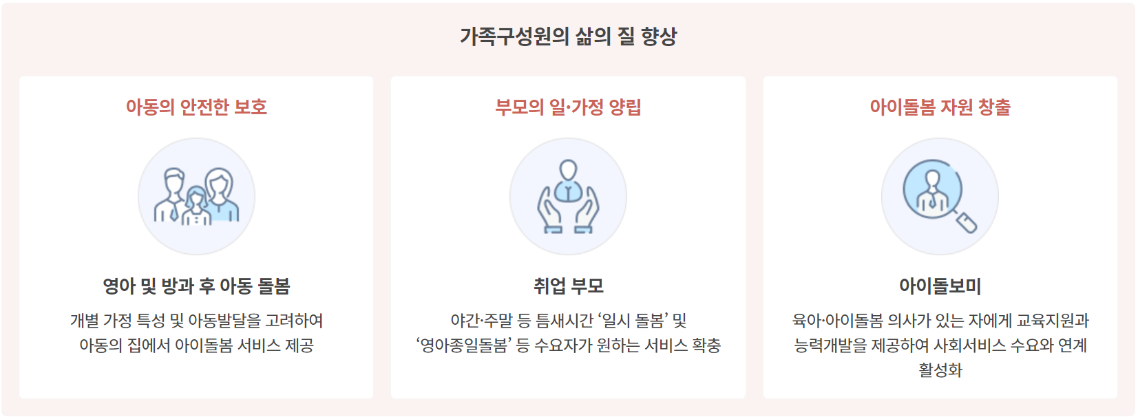 아이돌봄 지원사업은 가정의 아이돌봄을 지원하여 아이의 복지증진과 보호자의 일, 가정 양립을 통한 가족구성원의 삶의 질 향상과 양육친화적인 사회 환경을 조성하는데 목적을 두고 있습니다.