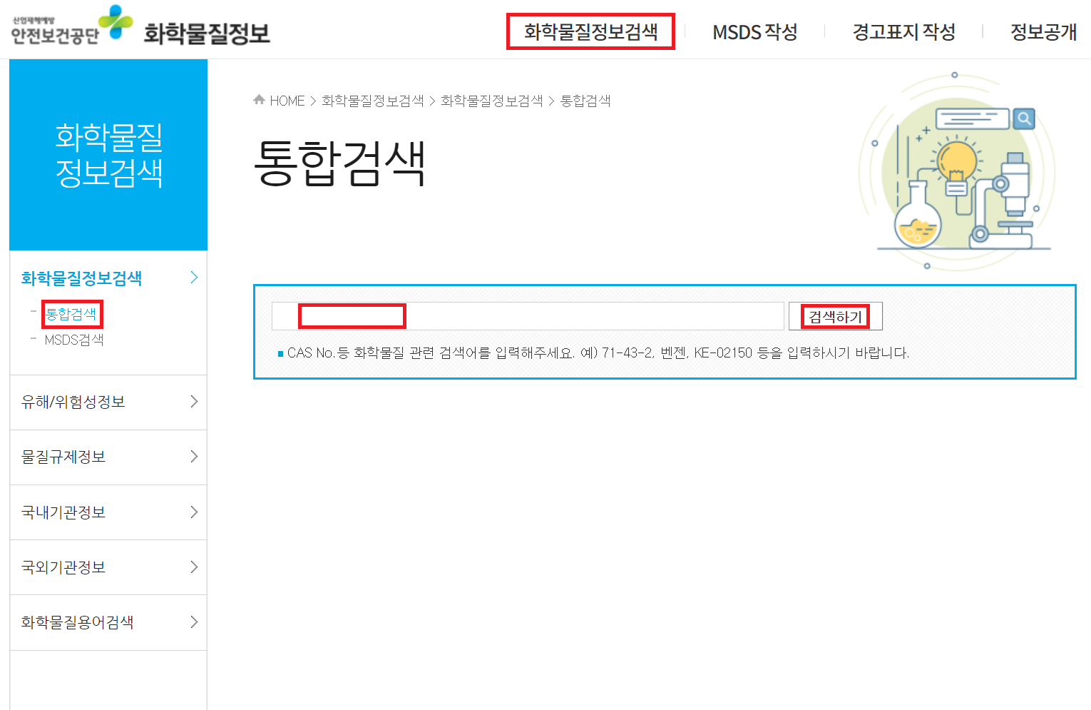 화학물질정보검색 클릭 > 통합검색에 찾고자하는 화학물질을 입력