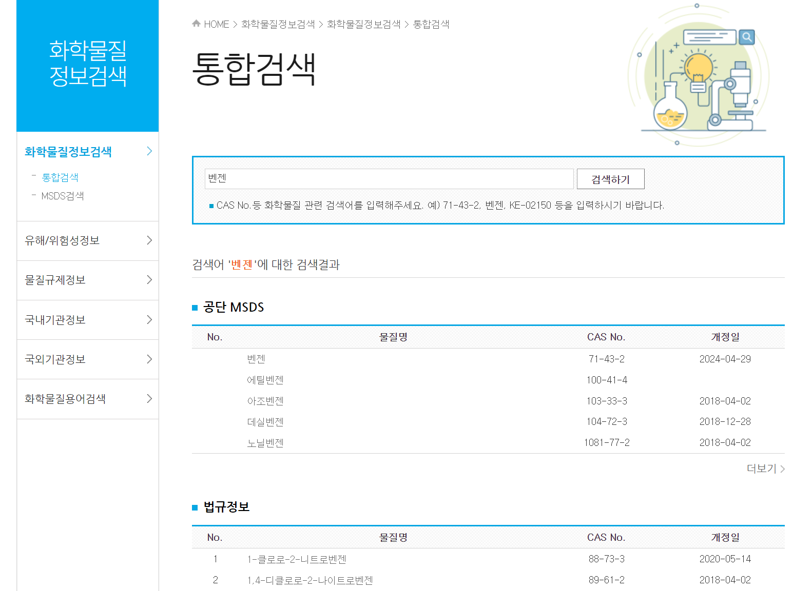 화학물질정보검색 클릭 > 통합검색에 찾고자하는 화학물질을 입력