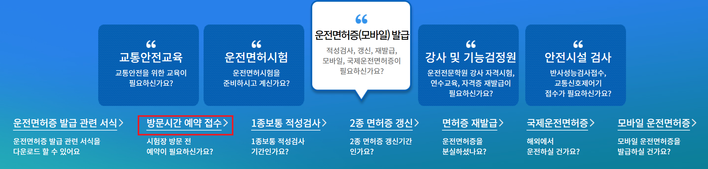 - 운전면허 시험장 : 전국 각 지역에 위치한 운전면허 시험장에서 운전면허 적성검사를 받을 수 있습니다.