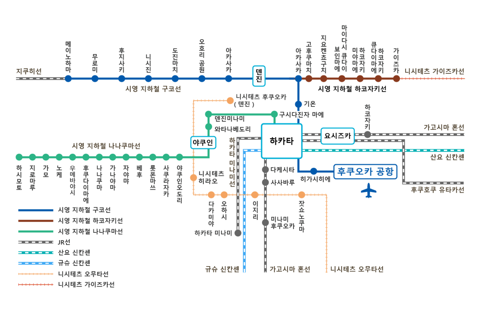 후쿠오카시 지하철 노선지도 위의 지도 이미지를 받으시려면 [후쿠오카_지하철노선지도_한글판.PDF]를 클릭해주세요.