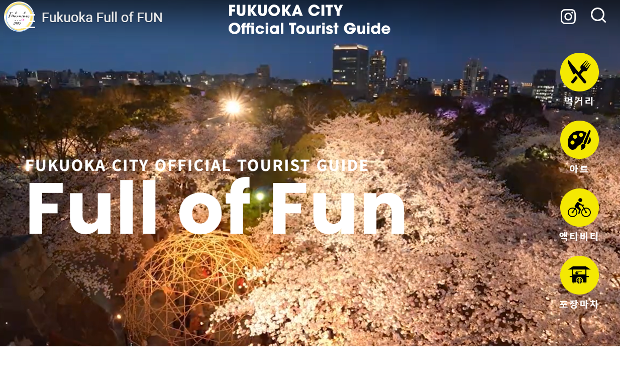 후쿠오카 여행 전 공식 여행 가이드 사이트를 방문하셔서 먹거리, 행사, 아트, 액티비티, 포장마차 등을 살펴보시길 바랍니다.
