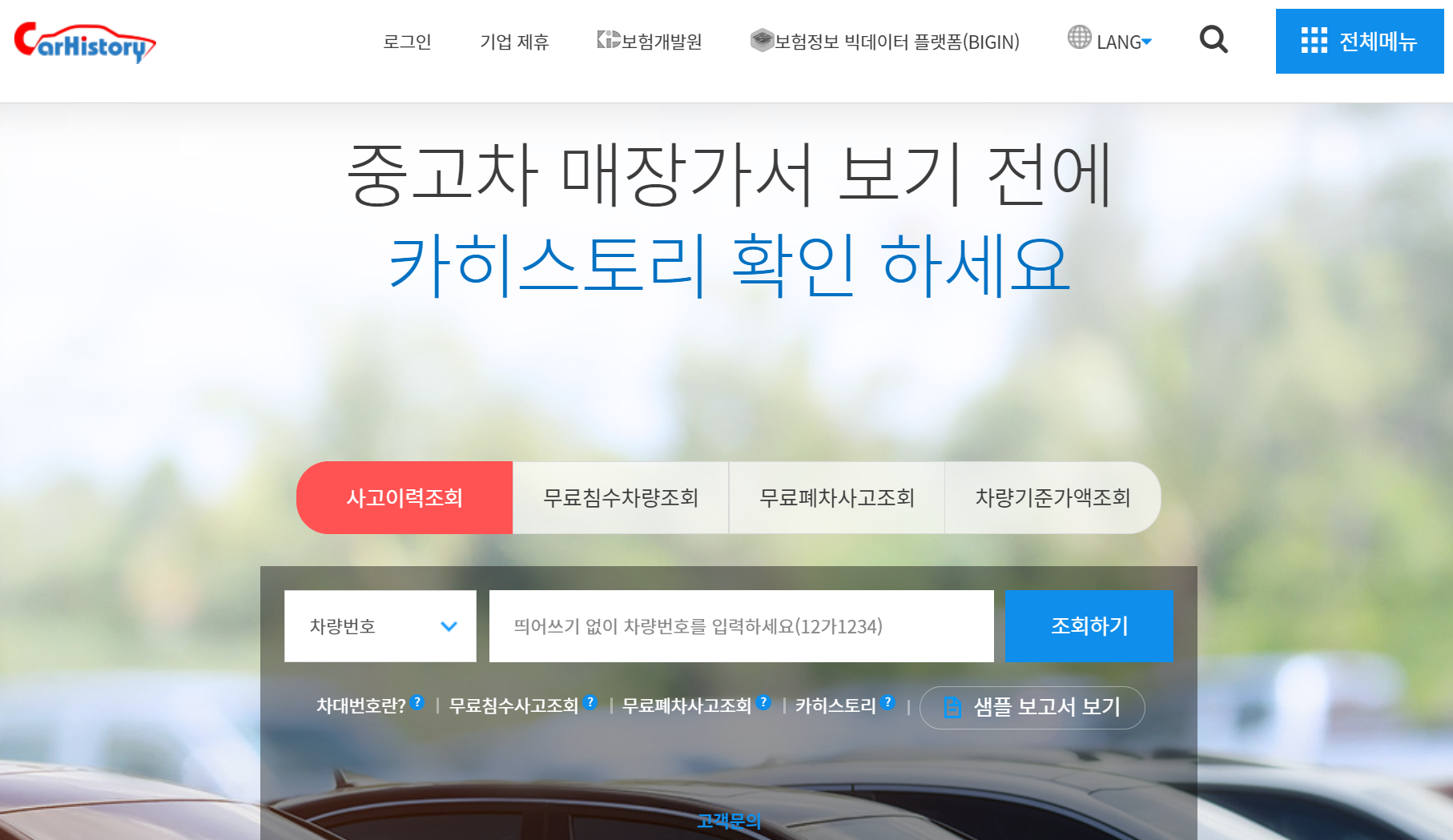 중고차 데이터를 제공하는 사이트 카히스토리에서는 차량의 보 험 처리된 사고 내역과 침수 내역, 도난여부, 특수 사고 여부, 용도 변경 이력, 소유자 변경 이력, 성능 점검 이력, 폐차 이력 등을 확인할 수 있습니다.