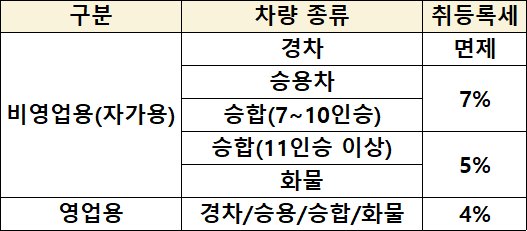 자동차 취등록세율은 위의 표를 참고하시기 바랍니다. 비영업용인 경차는 취등록세가 면제됩니다.