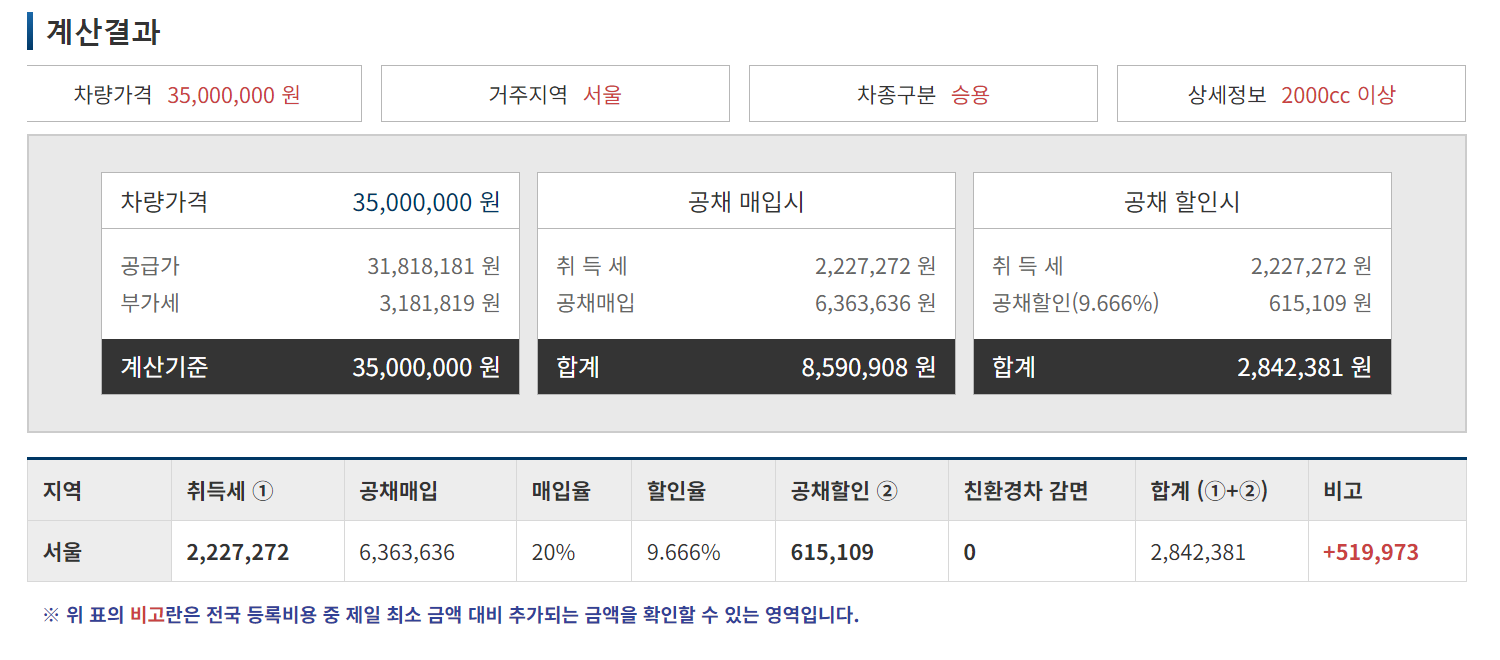 신차 등록비용 계산기 페이지에서 차량가격을 입력하고 차종구분과 거주지역을 선택합니다. 계산하기 버튼을 누르면 계산된 금액이 나옵니다.