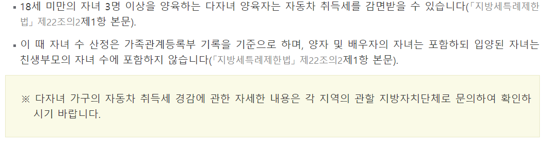 예시로 18세 미만의 자녀3명 이상을 양육하는 다자녀 가정이라면 감면 혜택을 받을 수 있습니다. (자녀2명은 2024년 하반기 적용 예정) 자동차의 종류에 따라 감면세액이 다르므로 자세한 내용은 각 지역의 관할 지방자치단체에 문의하시면 됩니다. 친환경 자동차라면 취등록세와 개별소비세 감면 혜택을 받을 수 있습니다.