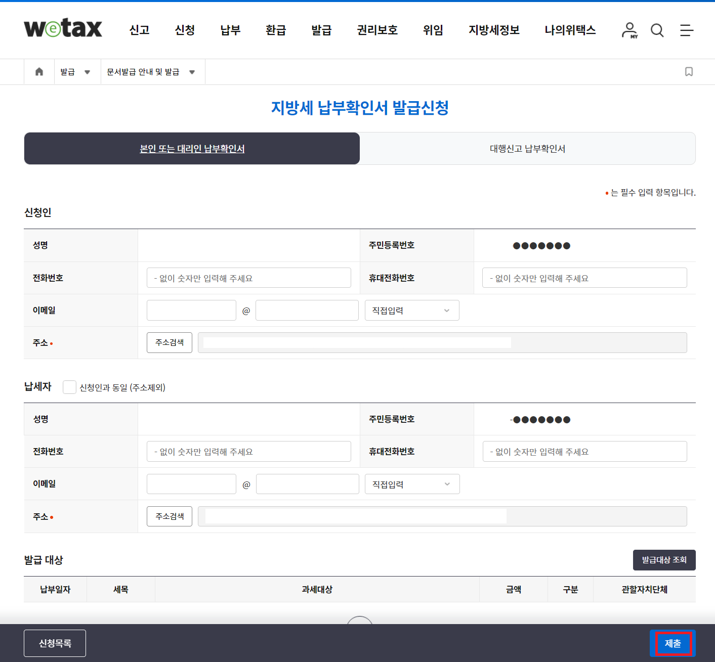 좌측에는 지방세 납부확인서를 클릭합니다. 본인 또는 대리인 납부확인서 선택하여 제출을 눌러 발급 받을 수 있습니다.