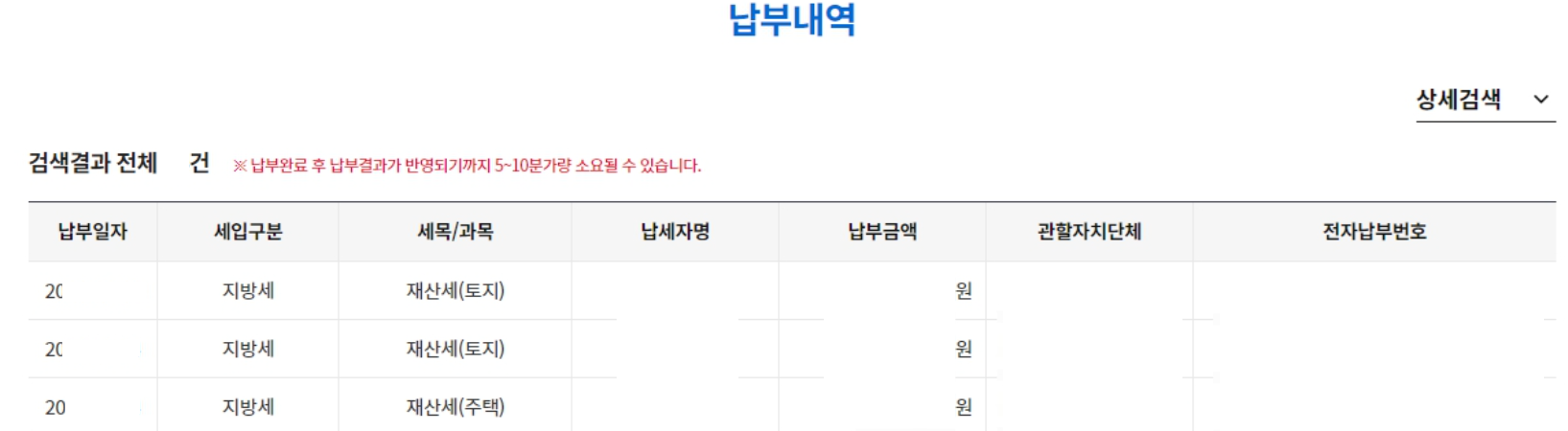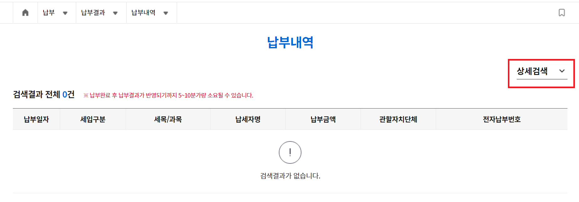 > 메뉴 '납부-납부결과-납부내역' 클릭 > 상세검색 클릭