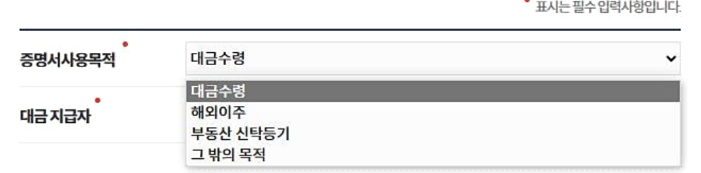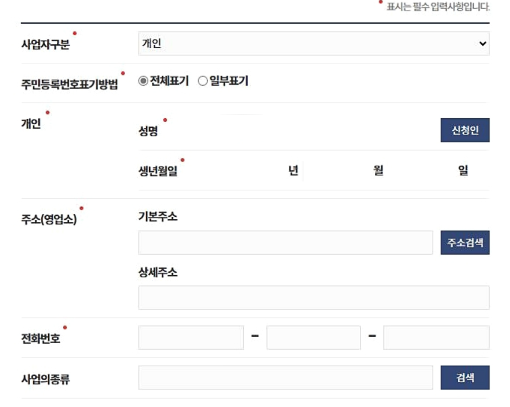 사업자 구분(개인/법인), 주민등록번호 표기 방법, 개인성명, 주소, 전화번호 등을 입력합니다. 증명서사용목적을 선택하고 대금 지급자도 입력합니다.