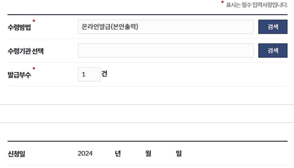 수령방법에서 온라인발급(본인출력)을 선택하면 직접 프린트 출력 또는 pdf로 발급 받을 수 있습니다. 민원 신청하기를 선택하면 됩니다. 문서 유효기간은 1달입니다.
