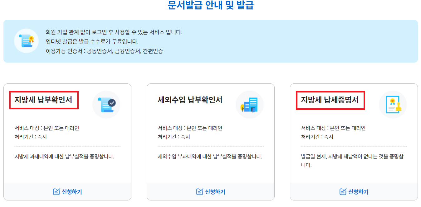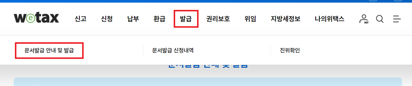 위택스 접속 > 인증서 로그인 > 메뉴 '발급-문서발급 안내 및 발급' 클릭