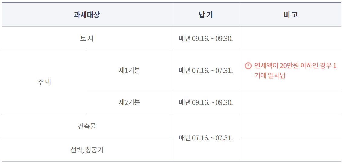 건축물, 선박, 항공기는 매년 7월 16일부터 7월 31일 사이에 납부해야 하고 토지는 매년 9월 16일부터 9월 30일 사이에 납부해야 합니다. 주택분은 연세액이 20만원 이하인 경우 1기인 7월에 모두 납부가 가능합니다.