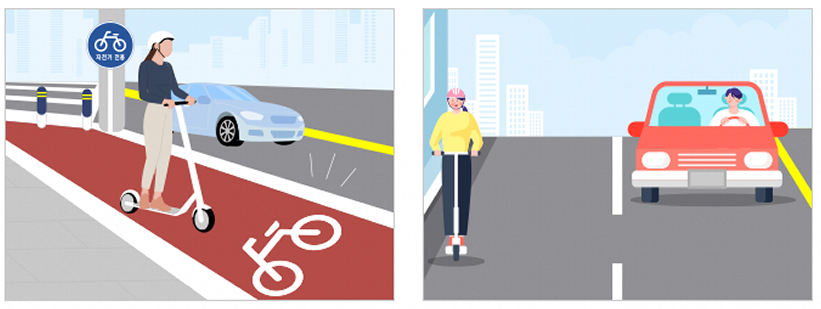 자전거도로 또는 차도 우측 가장자리를 통해 주행할 수 있습니다. 보도 통행은 원칙적으로 불가하며, 횡단보도에서는 내려서 끌고 가야 합니다.