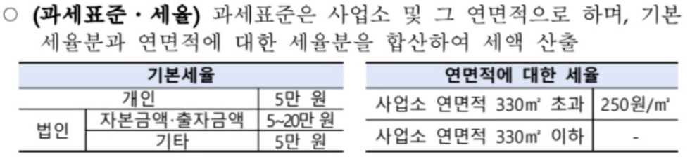 • 사업소분 : [개인사업자는 사업소별 과세, 법인은 사업소별 자본금규모에 따라 차등과세] + [사업소 연면적(330㎡이하는 과세면제)]