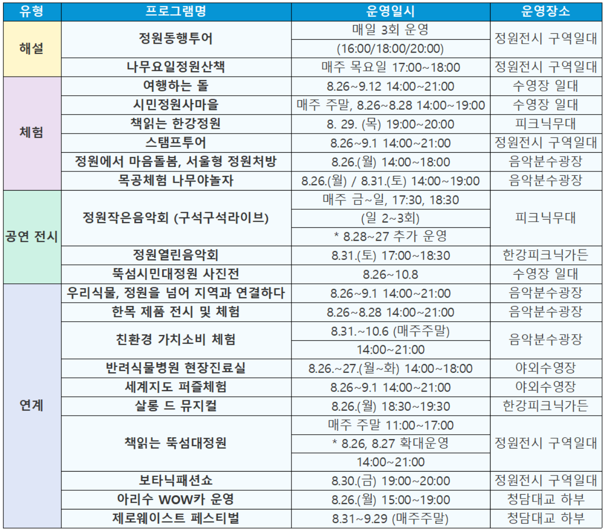 시민들이 참여하고 즐길 수 있는 다양한 체험 프로그램이 풍성합니다. 기존에 진행중인 서울국제정원박람회의 정원문화 프로그램과 함께 스탬프투어, 여행하는 돌, 책 읽는 한강정원, 정원 처방전, 목공 체험 등 특별한 프로그램들이 있습니다. 식물 및 친환경 관련된 행사, 뮤지컬, 음악 공연까지 풍성하게 이어집니다.