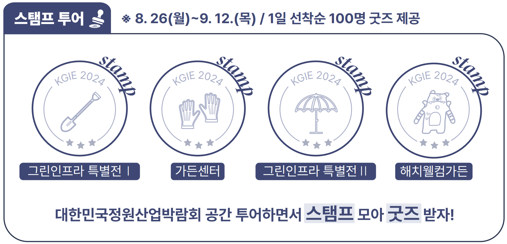 8월 26일 월요일부터 9월 12일 목요일까지 대한민국 정원산업박람회 공간을 투어하면서 1일 선착순 100명에 한 하여 스탬프를 모으면 굿즈를 드립니다. 박람회 방문시 팜플렛에 스탬프투어 도장을 찍을 수 있습니다.