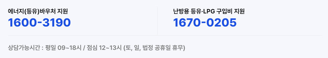 ● 고객센터 : 에너지(등유) 바우처 지원 1600-3190 / 난방용 등유, LPG 구입비 지원 1670-0205