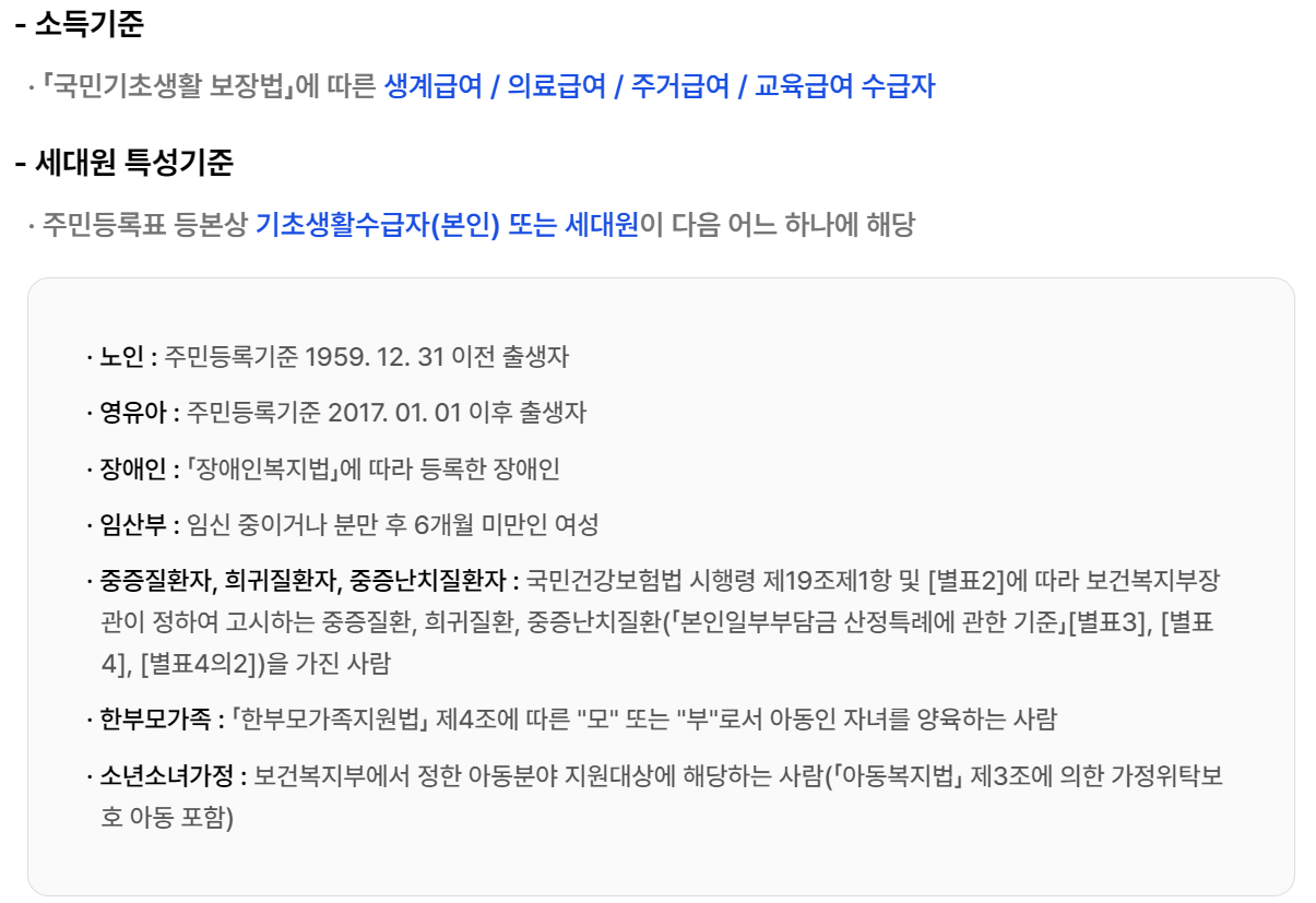 세대원 특성기준은 대상자 본인 또는 세대원이 노인, 영유아, 장애인, 임산부, 중증 희귀 중증난치질환자, 한부모가족, 소년소녀가정 중 하나에 해당하면 됩니다.