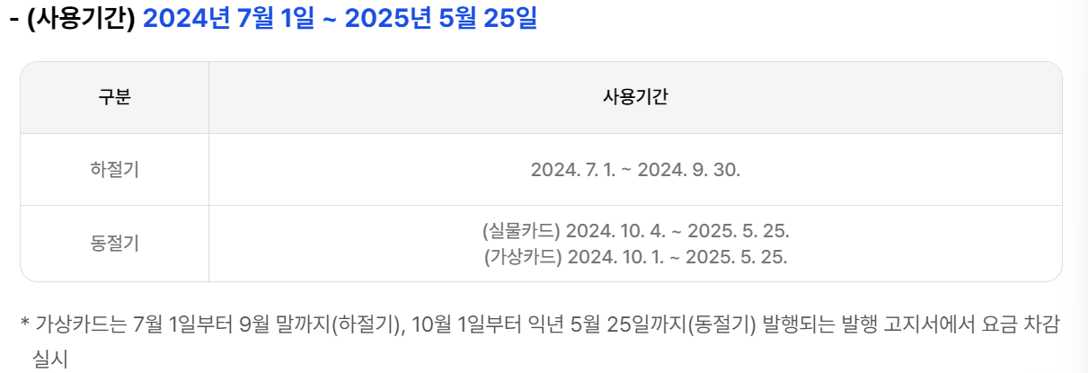 적합한 대상자가 제도 신청기간 내에 신청을 하면 사용할 수 있는 기간은 2024년 7월 1일(월)부터 2025년 5월 25일(일)까지 입니다.