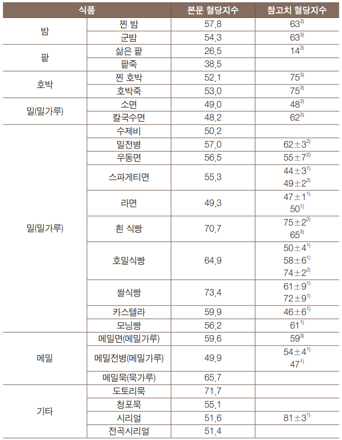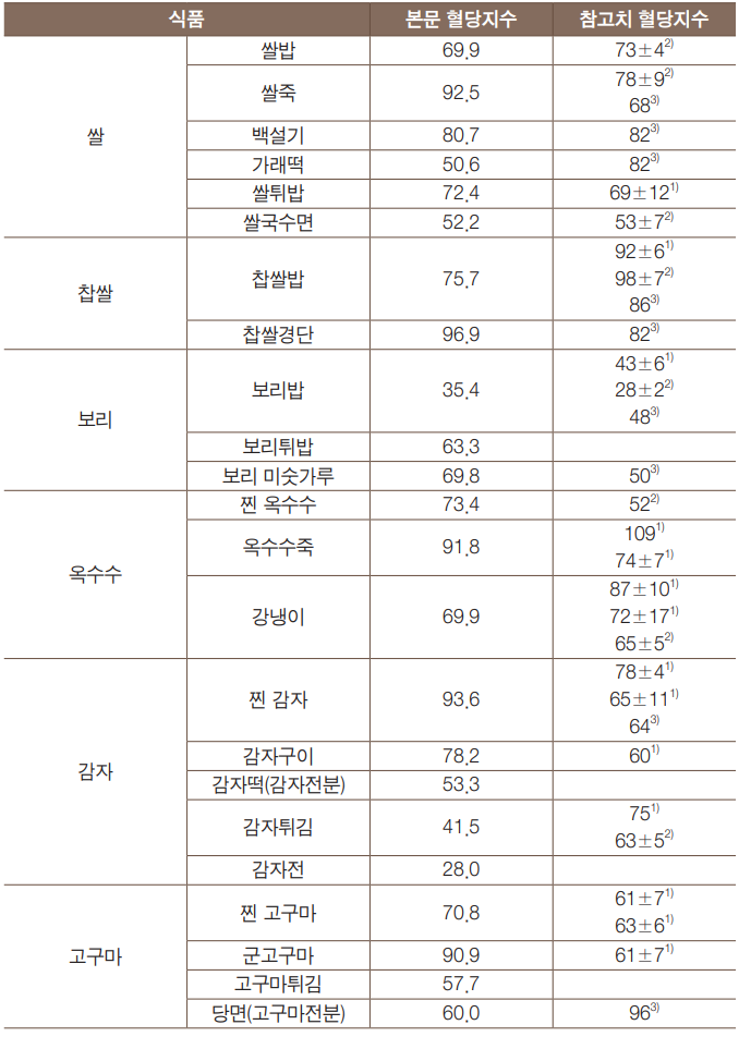 조리법에 따른 혈당지수로 보면, 혈당지수가 낮은 음식을 한눈에 구분할 수 있어 편리합니다. 찐감자(94), 군고구마(91) 보다는 찐 호박(52)이 낮고, 쌀밥(70)보다는 보리밥(35)이 혈당지수가 낮습니다.