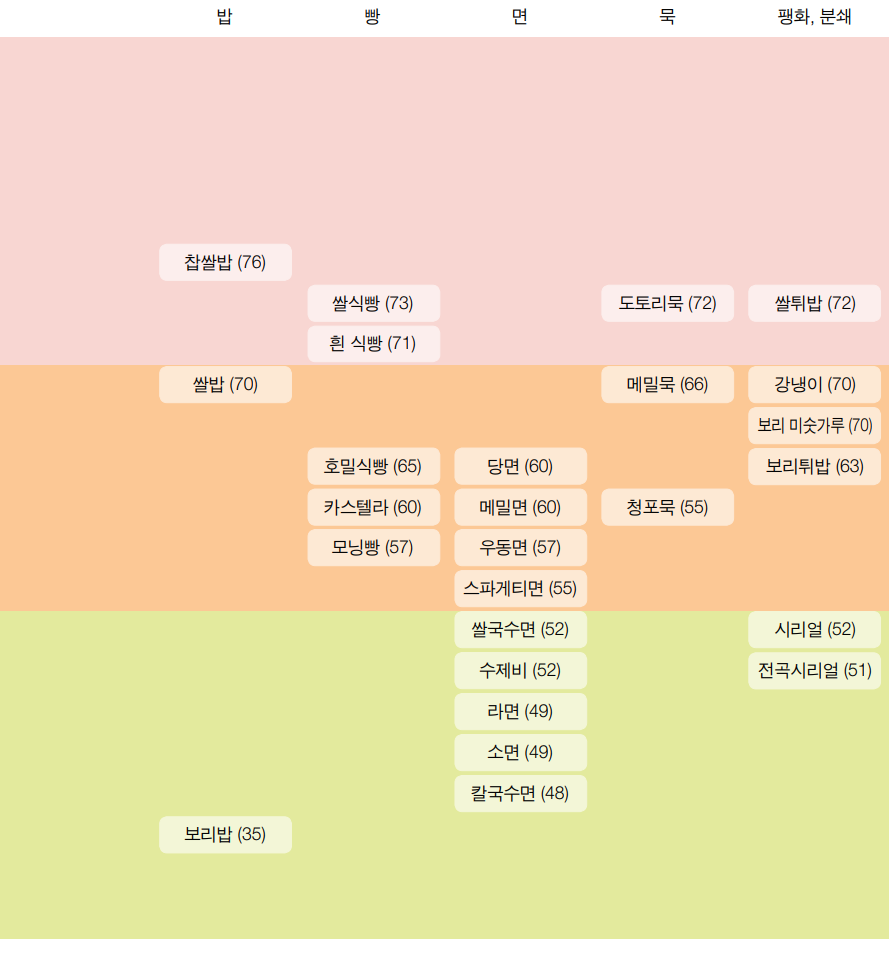 탄수화물 섭취가 감소하고 있음에도 불구하고 우리나라는 여전히 높은 비율을 차지하고 있습니다. 혈당지수(GI)와 혈당부하지수(GL)는 대사성 질환들에게 중요한 지표로, 식품의 혈당 반응에 따라 다르게 나타납니다. GI는 식후 탄수화물 흡수 속도를 나타내며, GL은 GI에 1회 섭취량의 탄수화물 양을 반영한 것입니다. 아래 데이터는 농촌진흥청과 경희대학교가 19~64세 성인남녀 기준으로 한국인의 주요 탄수화물 식품 50종의 GI와 GL을 측정하여 실용적인 데이터를 제공합니다. 이 연구는 2011년 국민건강영양조사를 바탕으로 했습니다.